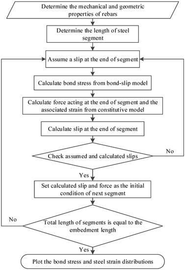 With the local bond–slip relationship, the bond–slip behaviour of long rebars or rods can be analysed by dividing the whole anchorage length into a group of steel segments, as shown in Figure 4, so that the bond stress over each steel segment can still be assumed to be uniform. Equations (4) and (5) shows the equilibrium and compatibility. It can be observed that the difference in forces at the two ends of the steel segment is equal to the bond force acting along the segment, and the difference in slips is the cumulative strain over the segment. By considering the equilibrium and compatibility for the steel segments from the free end to the loaded end, the profiles of bond stress, steel strain, and slip can be obtained by following the solution procedure presented in Figure 5. The analysis starts from the free end where the strain of the reinforcement or rods is zero. For a given slip at one end of the segment, the bond stress over the segment can be calculated from the proposed bond–slip model by assuming slip at the end of the segment. Thereafter, the slip at the other end of the segment can be calculated from the compatibility, and the stress can be computed from the equilibrium. Comparisons between the assumed and calculated slips should be made. If the difference falls within the prescribed tolerance, the slip, strain, and stress at the other end of the segment are determined and should be used as the boundary conditions of the next segment. The same procedure is repeated until the slip, strain, and stress over the whole reinforcement or the rods are quantified. Then, the load, slip, and strain at the loaded end of the reinforcement can be obtained from the study.