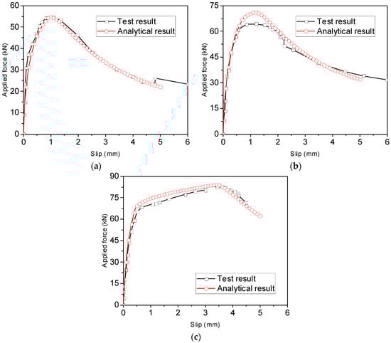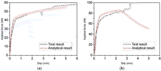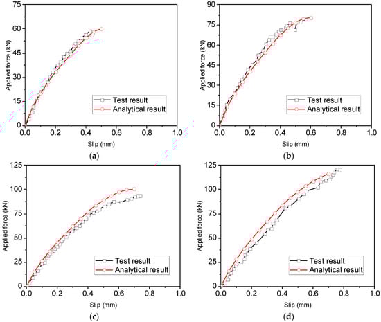 It should be pointed out that only pull-out failure or fracture of the rebars or rods can be considered in the analytical method, and thus, rebars and rods with the two failure modes were selected from the experimental results and used to verify the accuracy of the proposed analytical method. The force–slip relationship of reinforcement glued in the glulam was calculated using the proposed method. Note that during calculation, the deformation of the glulam itself was neglected.