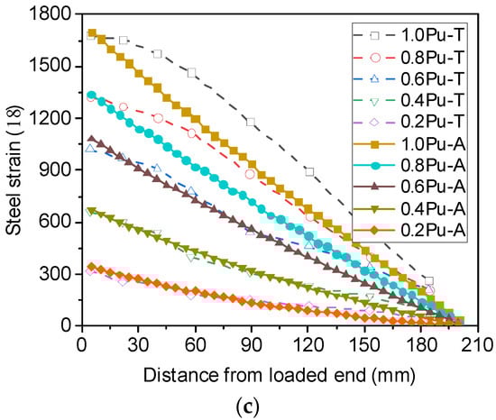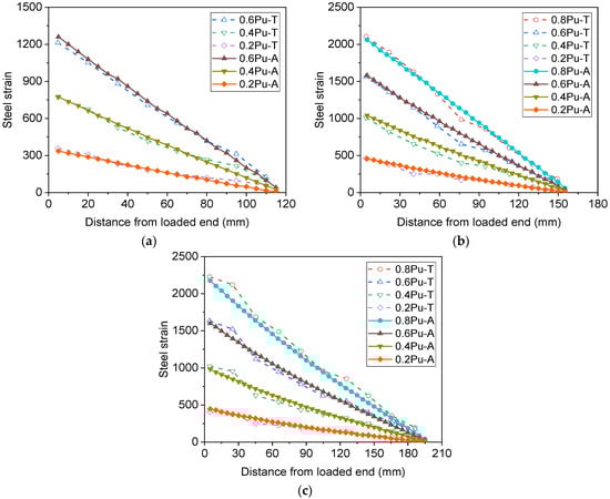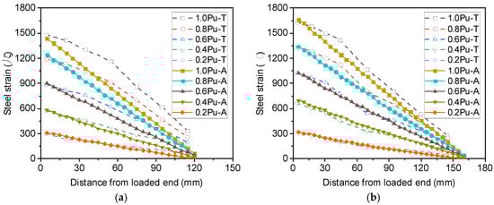 Besides the load–slip curves, the variation in steel strains along the anchorage length of the reinforcement can also be obtained using the analytical model, as shown in Figure 8. In the legend, 0.2 Pu denotes a load level of 20% of the ultimate load, and the last letters T and A represent the test and analytical results, respectively. Note that Pu in S16-200-2 was set to be the yield strength of the rebars [14]. It can be observed that the calculated strain decreases almost linearly from the loaded end to the free end at different load levels. Comparisons between the measured and calculated strain profiles of the reinforcement show that when the load level is no more than 60% of the ultimate load, the calculated strain profile agrees well with the measured one from the loaded end to the free end. However, with increasing load level, the strain profile levels off near the loaded end, and the analytical method substantially underestimates the strain in the region, particularly in S16-200-2. This phenomenon could have resulted from local bond failure near the loaded end while the load level was relatively high.