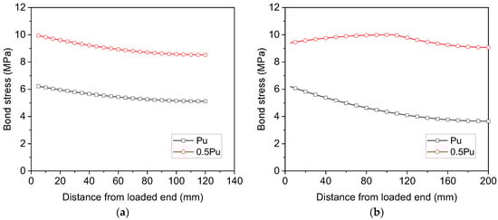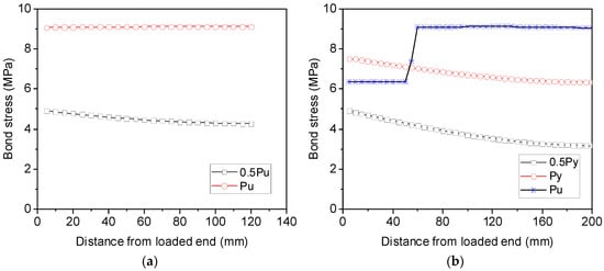 Figure 9 shows the profiles of bond stress over the anchorage length of S16-120-2 and S16-200-2. It can be observed from Figure 9a that for S16-120-2, the bond stress is not uniform when the load applied to the reinforcement is only 50% of its load capacity, with its minimum value at the free end and maximum value at the loaded end. However, nearly constant bond stress is distributed along the anchorage length once the maximum load of the reinforcement is attained. By increasing then anchorage length from 120 mm to 200 mm, the nonlinear bond stress distribution becomes more significant before the reinforcement yields at the loaded end, as shown in Figure 9b. Following yielding of the reinforcement, the bond stress drops to 6.4 MPa, but the bond stress over the elastic steel segment remains uniform. The calculated results from the analytical method agree well with the assumption made for calculating the post-yield bond stress using Equation (2).