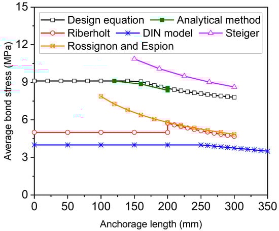 Figure 13 shows the relationship between the average bond stress and the anchorage length of the steel rebars. Note that the average bond strength at the glue/timber interface, calculated using Equation (11), is converted into that at the rebar/glue interface. The average bond strength is calculated using the analytical method by dividing the applied load by the area of the interface between the steel rebars and glue. As the analytical method can predict the overall load–slip curves with good accuracy, the calculated average bond strength is also close to test data. The average bond strength calculated from Equation (12) agrees well with that from the analytical model. Comparisons between the different equations suggest that the equations developed by Riberholt [3] and DIN 1052 [5] substantially underestimate the average bond strength of steel rebars. Steiger’s equation [4] predicts higher bond strengths than Equation (12). Rossignon and Espion’s equation predicts a similar variation to Steiger’s equation but significantly smaller bond strength. Moreover, the average bond strength determined using Rossignon and Espion’s equation is close to that computed using Riberholt’s equation when the anchorage length is greater than 200 mm.