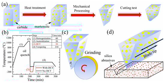 A study of the cutting performance of steel blades, following (a) the experimental procedures: (b) heat treatment with/without DCT and tempering on the raw steel plates, (c) mechanically fabricating the steel plates into a blade geometry with blade angle θe and (d) evaluating the cutting behavior of blades in the cutting tests.