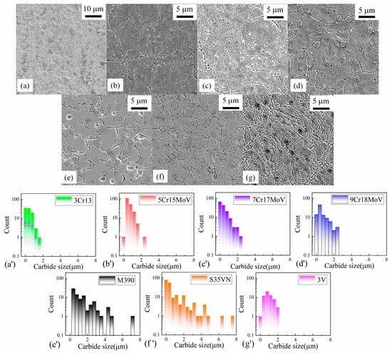 Microstructures of blade steels and size distribution of carbides imaged by SEM: (a,a’) for 3Cr13, (b,b’) for 5Cr15MoV, (c,c’) for 7Cr17MoV, (d,d’) for 9Cr18MoV, (e,e’) for M390, (f,f’) for S35VN and (g,g’) for 3V.