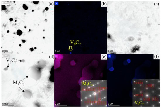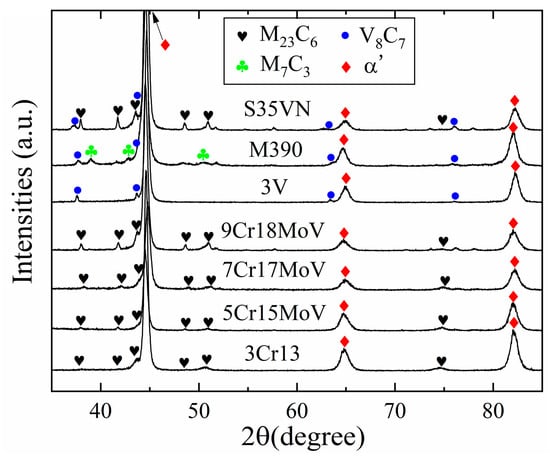 The microstructures of the blade steels were inspected using the scanning electron microscope, as displayed in Figure 2a–g. Carbide particles and a martensitic matrix were observed in these SEM images, and the size distributions of the carbides are displayed in Figure 2a’–g’. It seems that the number and size distribution of the carbides increases with the carbon content in the steels. The types of carbides in these steels have been investigated using the Co-Kα emission, combined with elemental mapping analysis in a previous study []. Only M23C6 carbide was found in the MSSs, and there was more M23C6 carbide in the steels with a higher carbon content. The carbide particles were V8C7 in the powder steel 3V, whereas the dominating M7C3 and some minor vanadium carbides were found in M390. Both M23C6 and V8C7 existed in the steel S35VN. The effect of these carbides on the wear resistance and hardness were discussed in a previous study []. In this current study, the carbide phases were verified using X-ray diffraction with the Cu-Kα emission as displayed in Figure 3. The minor vanadium carbide in M390 was identified as V8C7, and the carbide V8C7 was confirmed by the Selected Area Diffraction (SAD) pattern using the Transmission Electron Microscopy (TEM) technique, as shown in Figure 4e,f.