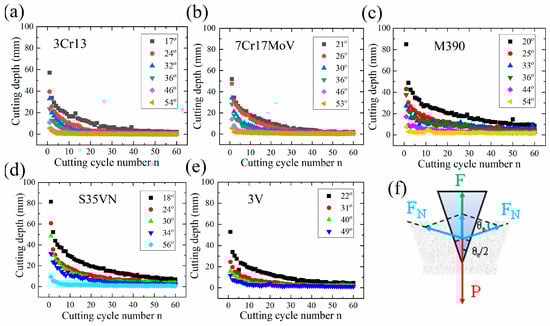 Cutting depth as function of the cutting cycle number n for the steel blades with various blade angles: (a) 3Cr13, (b) 7Cr17MoV, (c) M390, (d) S35VN and (e) 3V were achieved by a wedge-shape blade with a blade angle of θe in the diagram (f).