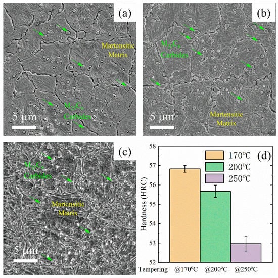 The hardness of steel 5Cr15MoV was found to decrease significantly with the increase of the tempering temperature, as shown in Figure 6d and Table 2. This softening in martensitic steels has been well accepted as a result of relieving processes during the tempering [], e.g., carbon diffusion, the decomposition of martensite and a formation of ε-carbide, and this softening effect has been found in similar high-carbon martensitic steels previously [,]. However, these processes were on a sub-micro scale and are hardly discernible in the SEM images (Figure 6a–c).