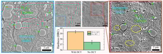 The hardness of martensitic steel can be further enhanced after quenching via Deep Cryogenic Treatment (DCT). In the cryogenic treatment, the steel specimens were treated at −196 °C to boost the martensitic transformation process. The microstructures of steel 9Cr18MoV with and without DCT are compared in Figure 7. Highlighted by yellow circles, the areas surrounded by the needle-like martensite are residual austenite [] that was unable to transform to martensite in the 9Cr18MoV after quenching without DCT, while these phases were rarely seen after DCT, and the matrix was filled with needle-like martensite. Consequently, the hardness was raised from HRC 57.45 ± 0.33 to HRC 59.35 ± 0.23 after DCT, as shown in Table 2.