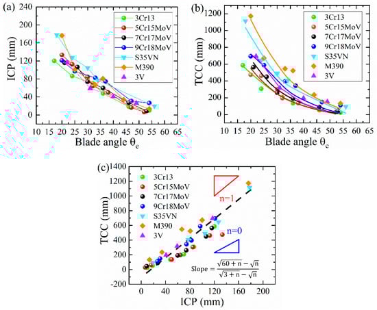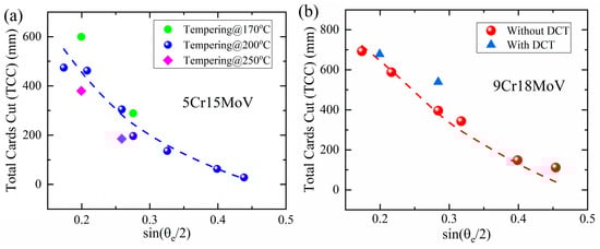 The total cutting depths of the blades made of tempered 5Cr15MoV and 9Cr18MoV with/without DCT were plotted as a function of sin(θe/2) in Figure 8a,b, respectively. According to the model developed previously, the Total Cards Cut (TCC) can be written in the following form: