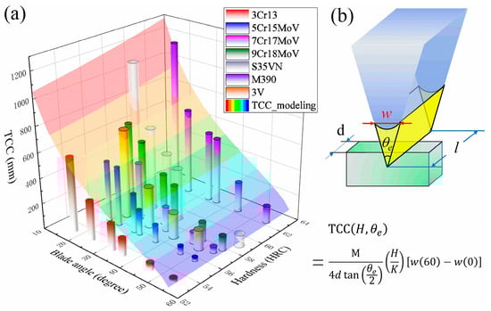 For the development of the blade industry, it is important and necessary to build up a comprehensive understanding of the cutting performance of steel blades, including their sharpness and its retention. Even though there are some pioneering studies on hair shaving by steel blades [,,] and the corrosion resistance of steel blades [], a more general application of blades in cutting bulk materials is still rarely discussed. As an pioneering exploration, a quantitative model [] has recently been established between the cutting depth and wear loss of a blade. This model can guide the development of novel blade steel and quality control in industrial production; however, it is still in its infancy. The effects of influential factors in the model (e.g., the hardness of the steel, blade angle and width of the blade tip) still need to be assessed individually in a larger database of blade steels. Moreover, the polish finish of a blade edge has been found to affect the force applied in cutting meat [], and a similar effect may also exist in the steel blades containing carbides, as the carbides can modify the profile of a blade edge in the cutting process []. Unfortunately, the effect of the micro-geometry of a blade edge was overlooked in the previous study [].