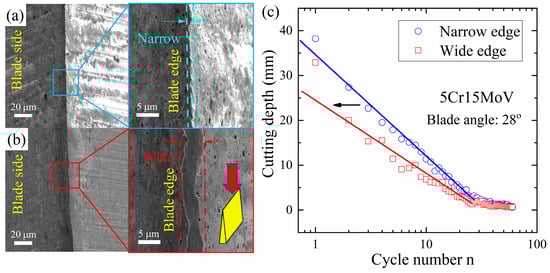 Comparison of top-down SEM images, as indicated by the red arrow, of 5Cr15MoV steel blade with a narrow edge (a) and a wide edge (b); and their cutting depths in paper cards (c).