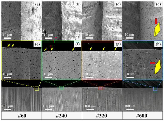 Top-down view (a–d) and side view (e–h) of SEM images of the blade edges made of 5Cr15MoV steel, which were ground into the wedge shape with the same blade angle of 27°using the grinding papers (a,e) 60#, (b,f) 240#, (c,g) 320# and (d,h) 600#.