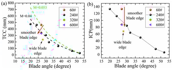 The influence of the micro-geometry of a blade edge on cutting performance has been inspected and is presented in Figure 13. Obviously, a rougher blade edge resulted in a larger cutting depth, in both the TCC and ICP, whereas the cutting depth reached a limit when finer sandpaper (240# or higher) was used to grind the blade. That is because a rough blade edge has a reduced contact area with the paper cards and raises the effective pressure, therefore enhances the cutting effect. On the other hand, when ground by finer sandpaper, the contact area approaches a fixed value, and a stable cutting behavior is achieved. According to the modeling of Equation (2), a higher M value (from 0.04 to 0.053 mm/MPa) is determined for a rougher blade edge (from 240# to 60#), and the cutting depth can be enhanced by approximately 32.5%. It should be noted that the micro-geometries like burrs and scratches produced by mechanical processing are likely to be bent down [,] due to plasticity and finally worn away [,] by the continuous, abrasive wear during cutting. It would be interesting to conceive a mechanism to maintain the “sharpness” of the blade edge.