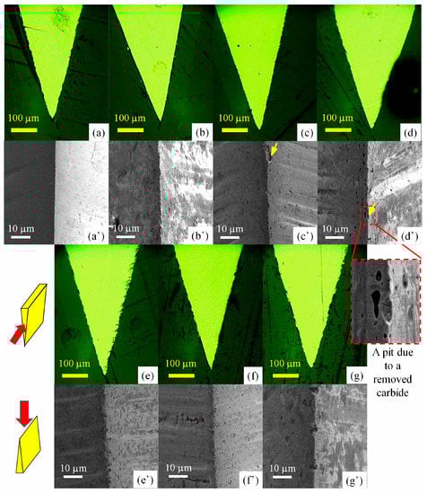 Cross section views of optical microscopic images (a–g) and top-down views of SEM images (a’–g’) reveal initial micro-geometries of blade edges made of various martensitic steels: (a,a’) 3Cr13, (b,b’) 5Cr15MoV, (c,c’) 7Cr17MoV, (d,d’) 9Cr18MoV, (e,e’) M390, (f,f’) S35VN and (g,g’) 3V. The red arrows indicate the direction to view the blade, and the yellow arrows mark the pits at the blade edges.