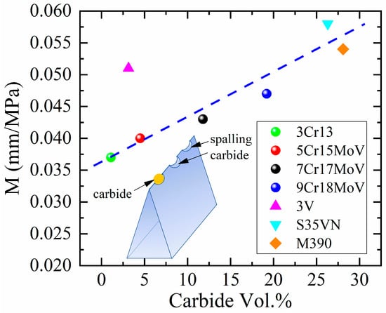 The correlation between the M values and carbide fractions (Vol.%) in steels is revealed in Figure 15. It was not surprising to find the M value increased linearly with the amount of carbide for most martensitic steels, since more carbide usually causes more pits at the blade edges and thus rougher edge geometries and therefore sharper cutting behavior []. However, the M value for 3V obviously deviates from the linear relation. Considering its low carbide fraction, the M = 0.051 for 3V is unexpectedly high. There are, mainly, two possible causes of this phenomenon. Firstly, secondary hardening [] occurs in the steel 3V when tempered at 540 °C, and carbon solutes diffuse out from martensite and form fine vanadium carbides [], as displayed in the TEM images (Figure 4a,b). Most of the vanadium carbides dropped off after electrochemical treatment in the preparation of the TEM specimen, because 3V is more prone to suffer corrosion due to its lower Cr content than other steels. The remaining V8C7 particle is indicated by a white arrow in Figure 4b. In contrast, no such fine carbides were observed in MSSs, e.g., 7Cr17MoV in Figure 4c or in other powder steels, e.g., M390 in Figure 4d–f. Secondly, the fine V8C7 particles probably bonded strongly with a martensitic matrix because a coherent interface [,] could form between the vanadium carbides and α-Fe; furthermore, extraordinary wear resistance was also found in 3V, which may also have been contributed by the strong carbide cohesion. The excellent cutting behaviors of the 3V blade could be the synergetic effect of the two causes mentioned above. The fine vanadium carbides adhered firmly to the blade edge, while the martensitic matrix receded due to wear loss. Finally, micro-saws were produced at the blade edge, exhibiting a high M value and an outstanding cutting performance. To be noted, V8C7 particles also existed in M390, but these particles always have a larger neighboring carbide and therefore are less stable; moreover, much fewer V8C7 particles were found in M390 than in 3V due to the absence of secondary hardening, so no extraordinary cutting behavior beyond the linear modelling was observed in M390.