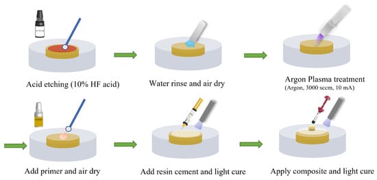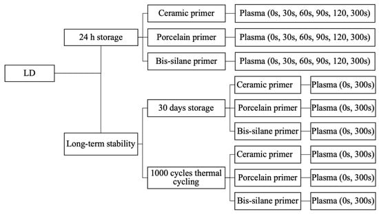 Figure 2 shows the preparation procedure and sample designation. Plasma treatment was performed on the air-dried HF acid-etched LD surface for different times (t = 30 s, 60 s, 90 s, 120 s, and 300 s). The rest of the bond procedures for the sample preparation were the same as for the control samples without plasma treatment. 15 test specimens were prepared and tested for each group. All the test specimens were stored in DI water at 37 °C for 24 h according to ISO/TS 11405 before proceeding to the micro-shear bond strength (μSBS) test [33]. The long-term storage groups were further divided into 30-day storage groups and thermal cycling groups. The 30-day storage groups were held for 30 days of storage in DI water at 37 °C. Thermal cycling was performed by alternatingly storing the specimens between two water baths with temperatures of 5 °C and 55 °C for 1000 cycles.