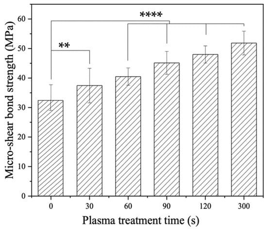 Micro-shear bond strength of LD-resin cement specimens prepared with 3M Ceramic primer versus plasma treatment duration, with 0 s being the untreated control. The test was performed on test specimens stored in 37 °C DI water for 24 h. (ANOVA: p = 0, Tukey mean comparison test: ** represents p < 0.01 and **** represents p < 0.0001).