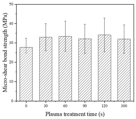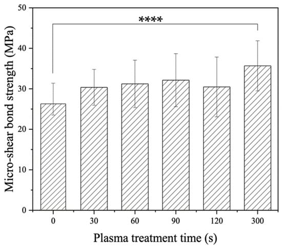 Figure 3 shows the μSBS results of plasma-treated LD-resin cement test specimens prepared using 3M Ceramic Primer along with the untreated control group, which is noted as having a plasma treatment time of 0 s. The LD-resin cement bond strength for the untreated control group was 32.6 ± 5.7 MPa. With plasma treatment, improvements in bond strengths were achieved. With plasma treatment time increasing, the LD-resin cement bond strength increased. A significant increase in bond strength was achieved for the plasma-treated groups with plasma treatment time variation from 30 s to 300 s as compared with the control group’s 0 s treatment time. The highest bond strength achieved was 51.9 ± 4.0 MPa, which increased by 59.1% as compared to that of the control group without plasma treatment. These results indicate that the plasma treatment can effectively enhance the bond strength between LD and dental resin cement using ceramic primer. The longer the plasma treatment was applied to LD surfaces, the greater the improvement in bond strength was achieved.