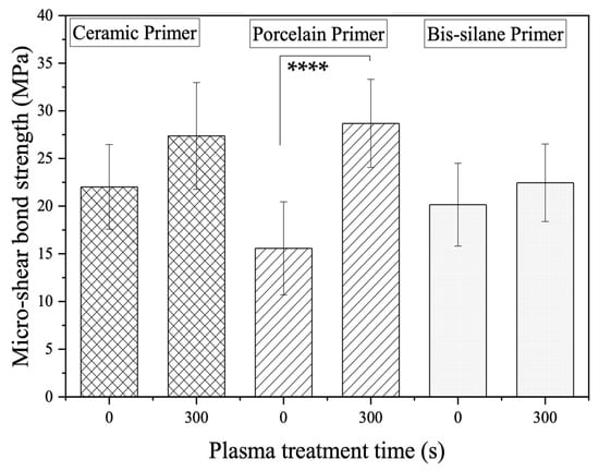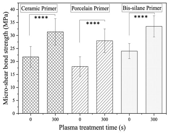 Comparison of micro-shear bonding strength of the untreated control specimens without (0 s) and with 300 s of plasma treatment for LD-resin cement specimens prepared with three primers. The test was performed on specimens after 1000 thermocycles. (ANOVA: p = 3.388 × 10−6 for ceramic primer, p = 4.686 × 10−7 for porcelain primer, p = 5.262 × 10−8 for bis-silane primer, and **** represents p < 0.0001).