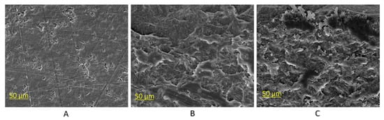SEM images of (A) the LD surface after polishing with sandpaper; (B) the LD surface after HF acid etching; and (C) the LD surface after HF etching followed by 300 s plasma treatment.