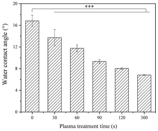 Water contact angle on no HF acid etched LD surfaces without plasma treatment (0 s) and with plasma treatment for different time from 30 s to 300 s. (*** represents p < 0.001).
