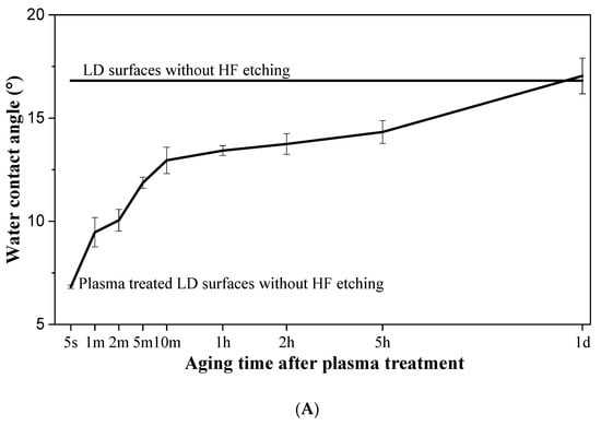 Figure 10 shows the water contact angle change on the no-HF acid-etched LD surfaces without plasma treatment and with plasma treatment at different times. It can be seen from Figure 10 that the HF acid-etched LD surface is very hydrophilic, with a water contact angle of ~17°. After plasma treatment, the water contact angles on the LD surfaces continuously decreased with plasma treatment time, indicating that the LD surfaces became more hydrophilic, and the surface energy increased with increasing plasma treatment time.