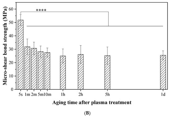 The effect of aging on plasma-treated LD surfaces was further examined in terms of water surface contact angle and micro-shear bond strength. Water contact angle measurements were performed on plasma-treated LD surfaces at different times, from 5 s to 24 h (1 day) after the plasma treatment. Similarly, the test specimens for the micro-shear bond strength test were prepared with the plasma-treated LD at different times, from 5 s to 24 h (1 day) after the plasma treatment.