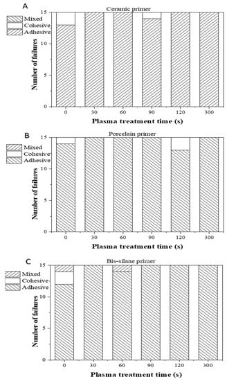 The null hypothesis of this study was that there would be no significant performance difference between sample groups treated with and without plasma. Based on the results herein, the null hypothesis was rejected. As shown in Figure 3, Figure 4, Figure 5, Figure 6 and Figure 7, with plasma treatment, the micro-shear bond strength of the LD-resin cement samples showed a significant improvement compared to the control group without plasma treatment. For 3M Ceramic primer, the bond strength of LD-resin cement increased by 59.1% with 300 s plasma treatment compared to the control group of 0 s plasma treatment. With plasma treatment, the LD-resin cement bonding strength increased to 23.9% and 36.2% for Bisco porcelain primer and Bis-silane primer, respectively.