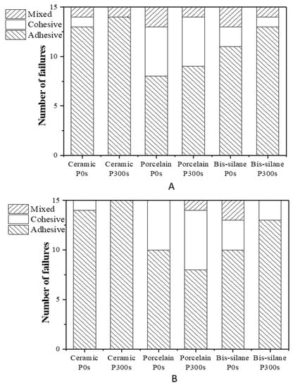 Micro shear bond failure modes after LD-resin cement test specimens prepared using three different primers after (A) 30 days of storage in 37 °C DI water and (B) 1000 thermocycles. P0s indicates no plasma treatment, and P300s indicates plasma treatment for 300 s.