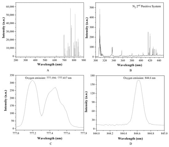 OES spectrum of the argon plasma: (A) the 300–900 nm wavelength region showing strong argon emission; (B) the 300–450 nm wavelength region showing nitrogen in the second positive system of the argon plasma; (C) weak oxygen emission between 777–778 nm; (D) weak oxygen emission at 844–845 nm.