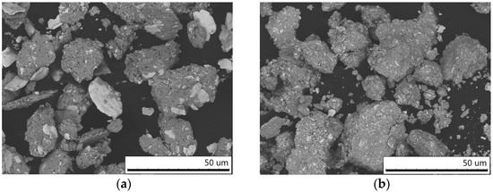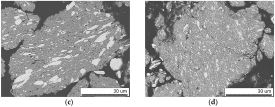 Figure 1a,b shows the morphology of the composite agglomerates of the W–C–3Cu powder mixtures prepared by MM. The starting components were distributed in the volume of agglomerates, which is seen on the cross-sections of the particles (Figure 1c,d). The formation of composite agglomerates is a typical process for the high-energy milling of metal-containing powder mixtures [10]. The W-rich areas are seen as light gray in the micrographs as tungsten is a heavier chemical element than copper. In the mixture milled for 3 min, large tungsten flake-shaped particles were observed, indicating a low mixing level (Figure 1a). In order to mix the components more thoroughly, the W–C–3Cu mixture should be milled for a longer duration. After 10 min of MM, large particles of tungsten were not detected in the W–C–3Cu mixture (Figure 1b).