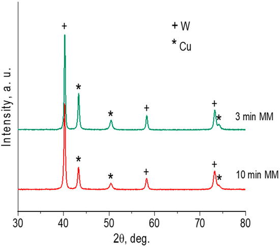 The XRD patterns of the milled mixtures show the presence of metallic Cu and W (Figure 2). No reflections of carbon can be detected on the patterns because of its relatively low concentration in the mixture. The broadening of the W and Cu reflections after 10 min of MM indicates a decrease in the crystallite size and the lattice strain accumulation, which is demonstrated by the results of the crystalline structure refinement (Table 2). The lattice parameters of W and Cu were equal to those of pure metals, confirming the absence of the mutual dissolution of the components during milling. The crystallite sizes of Cu and W phases were smaller than 100 nm, which indicates the formation of nanostructured agglomerates. There were no reflections of possible reaction products (carbides) on the XRD patterns. However, the products can be present in the milled powders in small amounts not detectable by the XRD analysis.