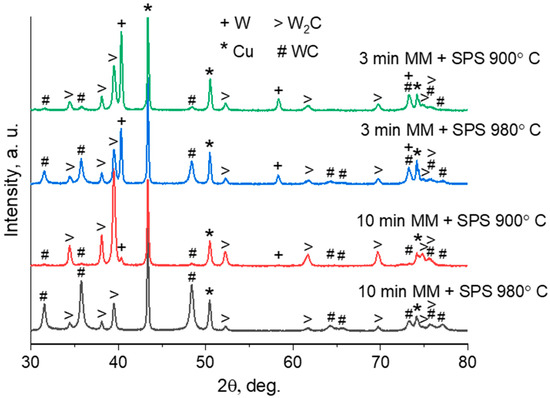 The XRD patterns of the sintered materials show W, WC, W2C, and Cu reflections (Figure 3). The estimated concentrations of phases in the compacts are shown in Table 3. The reflections of W are absent only on the XRD pattern of the compact obtained by milling for 10 min and SPS at 980 °C. The composition of this compact is WC–W2C–Cu–C, which means a complete conversion of tungsten into the carbide phases. The presence of the W2C phase implies that unreacted carbon remained in the sample. In all other cases, the SPS of the mechanically milled W–C–3Cu mixtures does not result in a full conversion of W to the carbides. The key factor hindering the in situ solid-state synthesis of WC–Cu composites is the absence of the mutual solubility of both tungsten and carbon in the copper matrix. During SPS, in agglomerates obtained by MM, the formation of the WC and W2C carbides begins at the boundaries between the tungsten and carbon particles. Thus, after a longer MM, due to the formation of new contacts between the reactants, the synthesis of carbides occurs at a greater number of locations. The XRD patterns of the samples sintered at 900 and 980 °C from the mixture milled for 3 min show strong W reflections, indicating the presence of the starting reactants in the consolidated materials. The reflections of the WC phase become more intense when the sintering temperature is increased from 900 to 980 °C for both mixtures. This means that the formation of WC (Equations (2) and (3)) occurs faster at 980 °C.