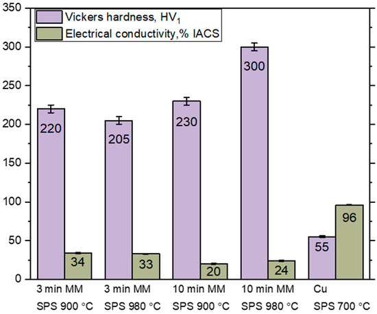 The electrical conductivity and hardness of a MMC depend on the concentration, size, and distribution of the reinforcing phase, impurity atoms in the matrix, crystallite sizes of the phases, and the porosity of the material. The hardness of the composite materials obtained in the present work was significantly higher than the hardness of sintered copper (Figure 5). The sample obtained by MM for 10 min and SPS at 980 °C demonstrated the highest hardness (300 HV1) in the studied series. In this compact, metallic tungsten was completely converted into the WC and W2C phases, which provided a high level of strengthening. The electrical conductivity of this WC–W2C–Cu sintered material is 24% IACS. In [12,24], materials with close compositions (53 wt.% WC–Cu and 40 wt.% WC–Cu) were manufactured. A nanocomposite of the 53 wt.% WC–Cu composition [24] exhibits a hardness of 426 HV and an electrical conductivity of 21% IACS. It was obtained by a complex four-step technology, including melting under pressure. The way proposed in the present work is simpler and allows reaching an excellent combination of properties. The spark plasma sintered ex situ 40 wt.% WC–Cu composite [12] showed a hardness of 226 HV and an electrical conductivity of ~40% IACS. In the approach used in the present work, the in situ synthesis of tungsten carbides in the mechanically milled mixtures is a way to improve the hardness of the material. A high level of electrical conductivity was ensured by the Cu-rich areas formed due to a local melting during SPS.