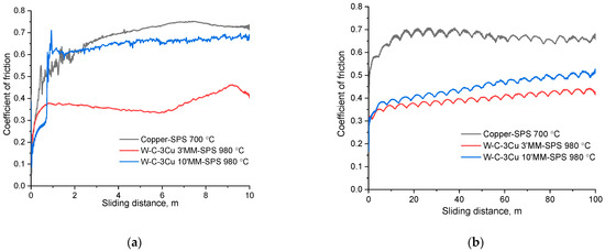 The COF values of the composites, irrespective of the counter-body material, were lower than those of sintered copper. Figure 9b shows strong stretches across the copper specimen after the test with the steel ball. On the worn surface of copper, an excessive plastically deformed metal was observed as a result of sliding by the WC-6Co ball (Figure 9e). Due to extremely high ductility and low hardness, the copper was worn off intensively. In the sintered composites, the tungsten carbide inclusions resisted the plowing effect of the counter-body, protected the material from destruction, and enhanced its wear resistance. In pairs with the steel ball, the W–WC–W2C–Cu–C compact (3 min MM—SPS 980 °C) showed the lowest COF value (0.37). The COF value of the sample obtained from the mixture milled for 10 min MM by SPS at 980 °C (WC–W2C–Cu–C composition) in a pair with steel was 0.62. This difference can be explained by the residual carbon black acting as a solid lubricant and decreasing COF. The concentration of residual carbon is higher in the composite obtained from the mixture milled for 3 min.