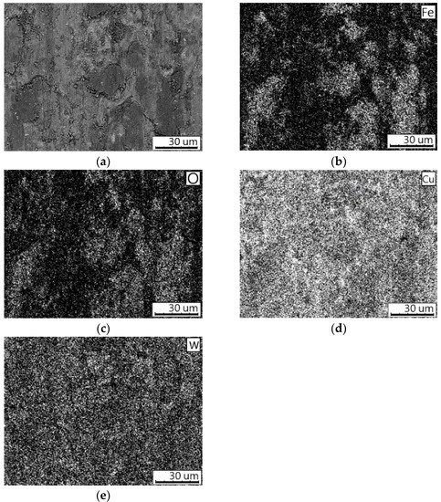 (a) The morphology of the worn surface of the compact obtained from the W–C–3Cu mixture milled for 10 min by SPS at 980 °C after a dry sliding wear test using the steel counter-body; (b–e) elemental maps of the area shown on (a).