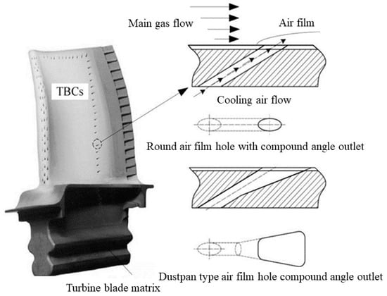 The aviation engine is a vital constituent of an aircraft, often hailed as its “heart”. To further enhance the thrust-to-weight ratio of aviation engines, it is imperative to elevate the turbine inlet temperature, imposing higher demands on the heat tolerance of turbine blades. Currently, turbine blades widely employ thermal barrier coatings (TBCs) and incorporate composite film cooling techniques, utilizing single-crystal hollow blades. These advancements significantly bolster the blades’ capacity to withstand elevated temperatures [1,2], as illustrated in Figure 1.