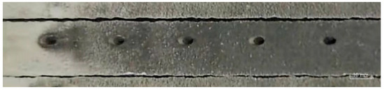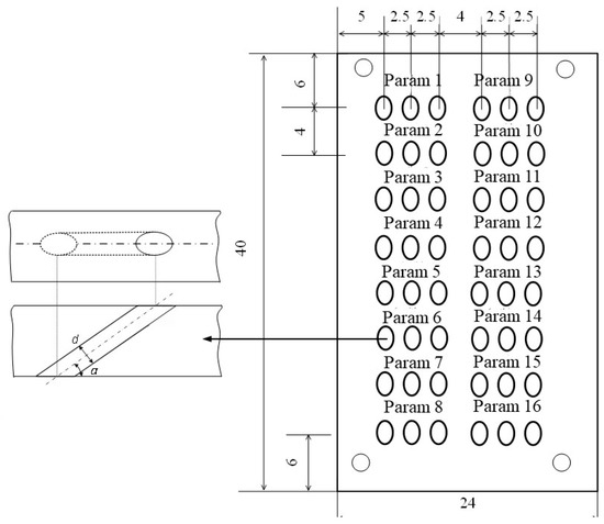 This study focuses on investigating the influence of average power and scanning speed on the damage patterns of thermal barrier coating (TBC) microholes in inclined bores. A comprehensive two-factor, four-level full factorial experimental design was implemented, as illustrated in Table 1. The laser power was varied from 12 W to 30 W, while the scanning speed ranged from 80 mm/s to 320 mm/s. The substrate material employed was a high-temperature nickel-based single-crystal alloy known as DD6. The ceramic layer of the TBC consisted of yttria-stabilized zirconia (YSZ) with a nominal thickness of 150 μm, and the bonding layer material was NiCoCrAlY with a nominal thickness of 20 μm. The TBC was fabricated using a gas-phase deposition technique. The dimensions of the experimental specimens and the layout of the micro-holes are depicted in Figure 2. The depth of the machined holes was approximately 1.5 mm.