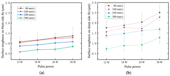 Surface roughness measurements were conducted at positions located 10 μm away from the blunt and sharp edges of the microholes, as shown in Figure 5. Figure 6 illustrates the relationship between surface roughness and process parameters on the blunt and sharp sides of the microhole circumference. The results indicate that on the blunt side, the surface roughness increases with an increment in pulse energy at a constant scanning speed. Conversely, at the same pulse energy, an increase in scanning speed leads to a reduction in surface roughness. The minimum roughness is achieved at a scanning speed of 320 mm/s and pulse energy of 12 W, which aligns with the smoother coating surface located further away from the hole edge. On the other hand, the sharp side of the microhole exhibits relatively higher surface roughness compared to the blunt side. The relationship between surface roughness and process parameters on the sharp side follows a similar trend to the blunt side but shows greater dispersion, indicating a more pronounced impact of picosecond laser processing on the surface roughness of the coating. This suggests that the coating surface on the sharp side is relatively more irregular. During the laser processing, due to the microhole structure, more ejected ablative material accumulates on the sharp side of the coating surface compared to the blunt side, resulting in higher surface roughness on the sharp side of the microhole circumference.