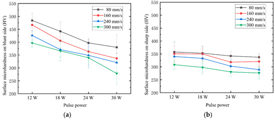 In this study, measurements were conducted on the coated surface of microholes, specifically at locations 10 μm away from the blunt and sharp edges of the holes. Two points were selected symmetrically around the microholes, with a separation of 10 μm on each side, as shown in Figure 7. A loading stress of 300 g was applied for a duration of 10 s. The average values of the two data sets were taken as the microhardness of the coating at the blunt and sharp edges, as illustrated in Figure 8. The results indicate that, overall, the microhardness of the coating at the blunt edges of the holes is generally higher compared to that at the sharp edges. Additionally, both the blunt and sharp edges exhibit similar trends, with the coating microhardness decreasing as the pulse energy and scanning speed increase. The inclined processing, influenced by the Gaussian distribution of the picosecond laser, has a more pronounced impact on the sharp edges. The molten plasma formed by laser irradiation adheres to the damaged surfaces of the acute-angle side of the hole walls and gradually accumulates, affecting the microhardness of the coating on the acute-angle side. However, due to the different physical structures, there is less accumulation on the obtuse-angle side, resulting in a lesser impact on the microhardness of the coating in that region. With increasing pulse energy and decreasing scanning speed, the thermal effects induced by the laser become more pronounced, which can affect the internal structure of the coating at the hole perimeters, resulting in defects and influencing the coating’s hardness.
