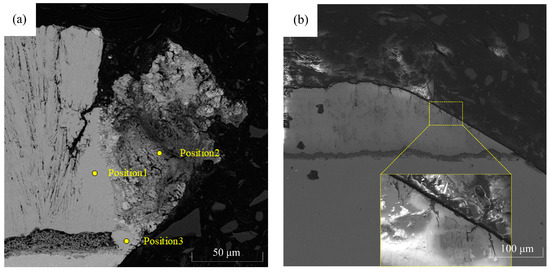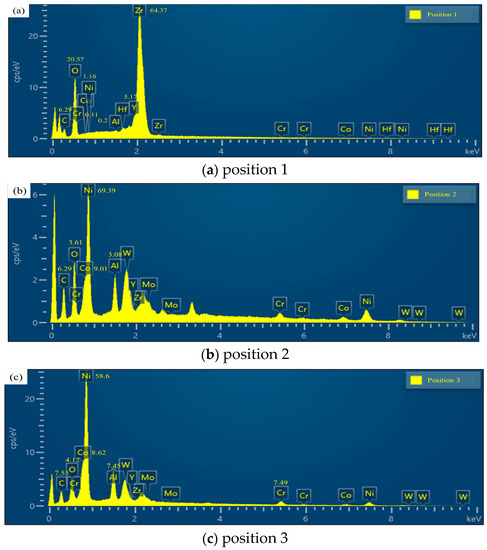 After the perforation process, the samples undergo cutting, grinding, and polishing procedures. The cross-sections of the microholes with thermal barrier coatings are observed using a scanning electron microscope (SEM), and the results are depicted in Figure 9. The figure reveals that the picosecond laser machining of thermal barrier-coated microholes does not result in any noticeable separation between the coating and the substrate. Furthermore, the substrate does not exhibit significant signs of remelting, microcracks, or heat-affected areas. However, various degrees of damage are observed in the thermal barrier coatings. Figure 9b shows that on the obtuse-angle side, there are fine cracks on the hole wall surface due to thermal stress. However, overall, the morphology of the coating on the obtuse-angle side is superior to that on the acute-angle side, possibly attributed to the contact of the plasma with the thermal barrier coating on the acute-angle side as it is expelled from the exit, resulting in damage. Energy-dispersive X-ray spectroscopy (EDS) analysis is performed on different positions along the sharp edge of the microhole entrance (Figure 9a): position 1 corresponds to the undamaged region, position 2 corresponds to the damaged region, and position 3 corresponds to the bond coat. The results, shown in Figure 10, present the elemental composition, which is further detailed in Table 3.