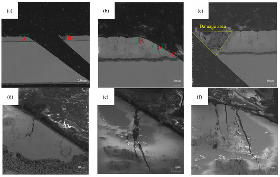 Assessment of damage to the thermal barrier coating on the microhole. (a) The macroscopic morphology of the cross-section of the microhole. A is the obtuse side, and B is the sharp angle site; (b) the morphology of the obtuse position; (c) the morphology of the sharp angle position; (d) the magnified image of region C; (e) the magnified image of region D; (f) the magnified image of region E.