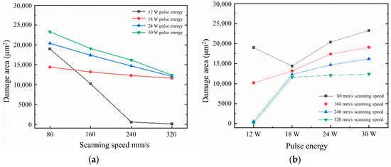 Effects of process parameters on the damage area of sharp-angle microhole. (a) The relationship between scanning speed and damage area; (b) the relationship between pulse energy and damage area.