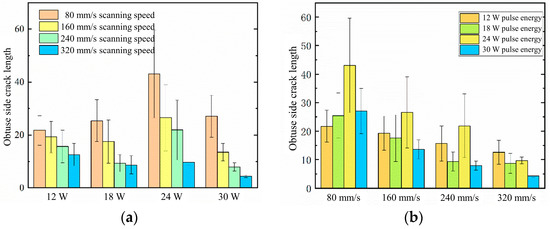 Relationship between the process parameters and damage area. (a) The relationship between the pulse energy and crack length on the obtuse angle side; (b) the relationship between the scanning speed and crack length on the obtuse angle side.