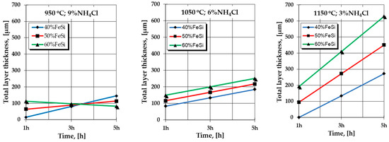 Figure 7. The optimal dosage of the proportion of FeSi75C from the powdery solid mixture used (FeSi75C + 3%NH4Cl + Al2O3) and the holding time at 1150 °C, to ensure a certain total layer thickness, in the case of P265GH grade steel.