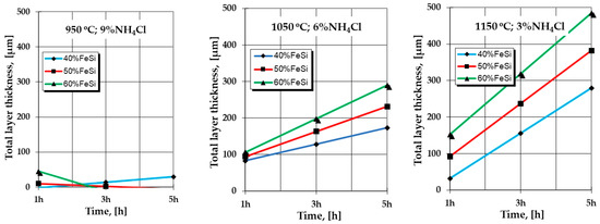 High proportions of the component with the role of activator (NH4Cl), at the upper limit of the range of values adopted in the active experimental program (i.e., 9%) and associated with temperatures at the lower limit of the same program (950 °C), apparently generate some deviations from the expected mode of variation of the total thickness of the silicide layer, depending on the proportion of the active component in the mixture (%FeSi75C powder) and, respectively, the holding time, as shown in Figure 1 and Figure 2.