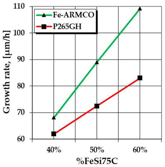 Comparative analysis between the growth rates of the silicide layers depending on the proportion of the active component of the powdery solid media (%FeSi75C), for Fe-ARMCO and P265GH grade steel, at 1150 °C and in the presence of 3%NH4Cl.