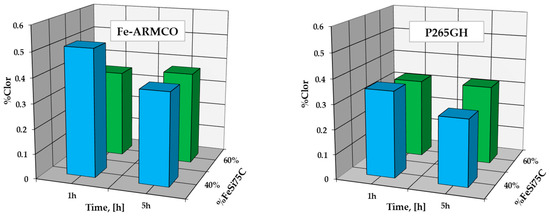X-ray fluorescence investigations carried out on the samples of the two metallic materials silicon cemented at the lower limit of the temperature range, i.e., at 950 °C and at, respectively, high proportions of halide in the powdery solid media (9%NH4Cl), highlight the existence of some concentrations’ high levels of chlorine in the superficial areas of the silicide layer along the coating thickness, as shown in Figure 4.