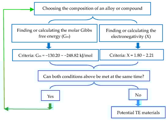 Because the molar Gibbs free energy of a compound is easily found in the thermochemical data book or calculated, and its electronegativity is easily calculated using the geometric mean value of Mulliken electronegativity, the potential of a material as a high-performance thermoelectric material can be easily and quickly determined. In order to facilitate the screening of TE materials using molar Gibbs free energy (Gm) and electronegativity (X), a schematic diagram of the screening process is shown in Figure 1.