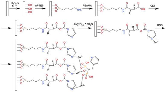 First, the plates were placed in CDI (Sigma Aldrich, Wuxi, China)–acetone solution (1.34 g in 6.5 mL) for 24 h, maintaining room temperature, and at the end washed to remove unreacted CDI. Then, the complexation process was carried out three times in 0.5 mol Zn solution for 24 h each. After this time, the samples were rinsed three times with water in order to remove excess free ions from the surface (3 times for 15 min).