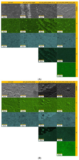 (A) EDS analysis (part I)—the images of elements distribution for samples: (a) Ti_HO; (b) Ti_HO_APTES_PEAMA; (c) Ti_HO_APTES_PEAMA_CDI_Zn; (d) Ti_HO_APTES_PEAMA_CDI_Zn_RSD. (B) EDS analysis (part II)—the images of elements distribution for samples: (e) Ti_AHT; (f) Ti_AHT_APTES_PEAMA; (g) Ti_AHT_APTES_PEAMA_CDI_Zn; (h) Ti_AHT_APTES_PEAMA_CDI_Zn_RSD.
